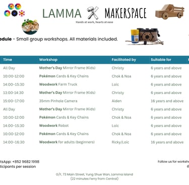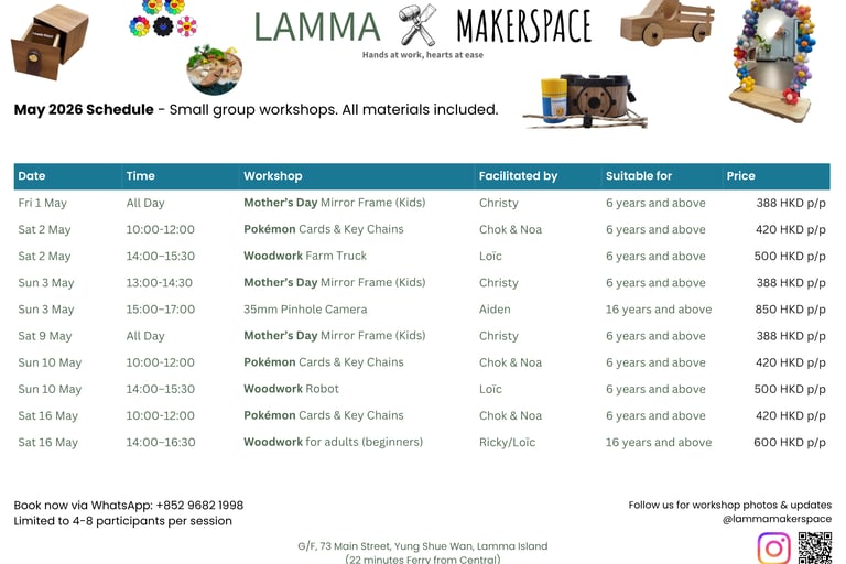 Hands-on woodworking and creative workshops for kids, adults and families.